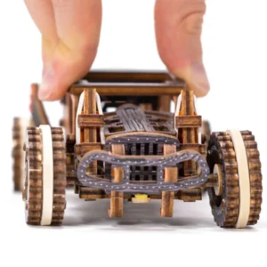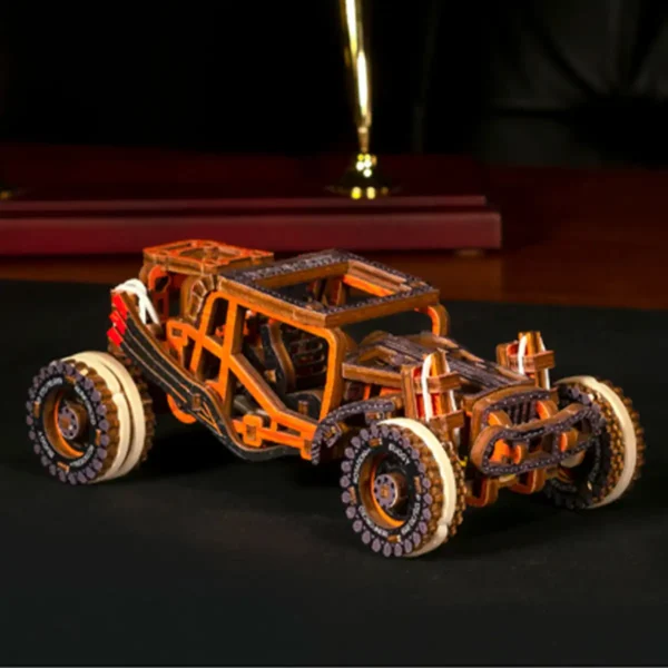 A Buggy a klasszikus homokfutók és könnyű terepjárók stílusát idézi. Letisztult, mégis karakteres vonalvezetése és finoman kidolgozott részletei modern, mechanikus eleganciát sugároznak. A lézervágott, színes faelemek élettel telivé teszik a modellt, miközben a funkcionális mozgásmechanizmus életet lehel belé.