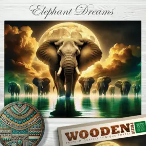 A 2000 db-os Elefánt álmok fa puzzle nem csupán egy kirakós, hanem egy mély jelentéssel bíró, művészi élmény. Ez a különleges, prémium minőségű fa puzzle egy lenyűgöző elefántcsaládot ábrázol misztikus, álomszerű környezetben, ahol az aranyló fények, a mély zöld és barna tónusok, valamint a víz tükröződése nyugalmat és harmóniát sugároznak. Az elefánt az erő, a bölcsesség, az emlékezet és a családi kötelékek szimbóluma – így ez a puzzle tökéletes választás mindazok számára, akik nemcsak kikapcsolódni, hanem feltöltődni is szeretnének.