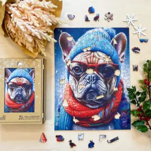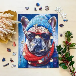 A bulldogok világa tele van karakterrel — és Gustav ezt maximálisan megmutatja. A hosszú téli sál dús mintái, a puha kötött sapka struktúrái és a bulldog természetes ráncai mind külön-külön élményt nyújtanak a kirakás során. A puzzle minden egyes darabja hozzájárul ahhoz, hogy ez a karizmatikus, kissé zsémbes, mégis imádni való kutya lassan, lépésről lépésre összeálljon.