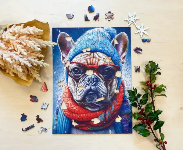 A Gustav, a morcos bulldog puzzle igazi meglepetése a különleges formájú fa darabok sora: kis bulldog alak, sapka, csizma, napszemüveg, fagyöngy, pulcsi és más, a kutya téli hangulatához kapcsolódó motívumok rejtőznek a kirakóban.