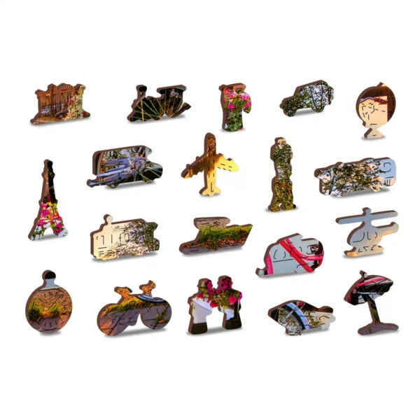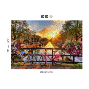 A Kerékpárok Amszterdamban fa puzzle minden egyes darabja aprólékosan megörökíti Amszterdam lényegét – a gazdag történelméről, gyönyörű csatornáiról és természetesen jellegzetes kerékpárjairól híres városét. Ahogy elmerülsz az összeállításában, szemtanúja leszel egy békés híd vibráló képének a város szívében, amelyet a Hollandiáról híres színes biciklik borítanak.