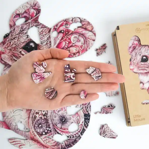 A Kis Egér Kirakó bájosan ötvözi a művészetet és a kifinomultságot. Ez a gyönyörűen kidolgozott fa kirakó egy aprólékosan díszített egeret ábrázol, elbűvölő mintákkal, kifejező szemekkel és meleg színekkel. Játékos, mégis elegáns, tökéletesen megragadja ennek a kis lénynek a kíváncsiságát és kecsességét. Szórakoztató és kielégítő kihívás kirakórajongóknak és állatbarátoknak egyaránt!