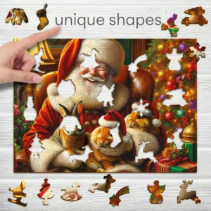Ez az egyedi fa kirakó nemcsak egy lenyűgöző képet formáz, hanem különleges élményt is kínál a kirakás során. A Mikulás és a három aranyos nyuszi jelenete egyszerre idézi meg a karácsony meghittségét, az állatok iránti szeretetet és az ünnepi időszak varázsát. A puzzle minden korosztály számára élvezetes, legyen szó gyermekekről, akik izgalmas részleteket fedezhetnek fel, vagy felnőttekről, akik pihentető kikapcsolódásra vágynak. A kirakott kép magával ragadó történetet mesél el, amely garantáltan mosolyt csal az arcokra, és szívet melengető ajándékként vagy dekorációként is tökéletesen megállja a helyét.