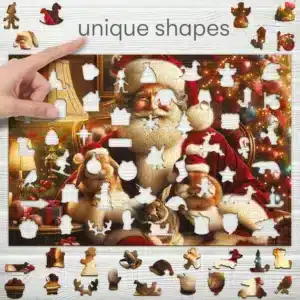 Ez a fa kirakó nemcsak a végső képet teszi lenyűgözővé, hanem a kirakási folyamatot is különlegessé varázsolja. Minden egyes darab egyedi formát kapott, ami azt jelenti, hogy minden elem önálló műalkotásként is megállja a helyét. A darabok között találhatunk olyanokat, amelyek apró nyuszikat, Mikulás-sapkákat vagy más karácsonyi szimbólumokat formáznak, például csillagokat, ajándékcsomagokat és karácsonyi harangokat. Ezek az elemek játékosságot és különleges élményt adnak a kirakásnak, hiszen nemcsak a kép összeállítására koncentrálhatunk, hanem közben felfedezhetjük az apró részletek varázsát is.