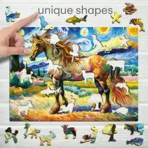 A Modern ló fa kirakó egyedülálló kombinációja a természet iránti szeretetnek és a művészet iránti rajongásnak. Az élénk színek, az élethű lóábrázolás és a festményszerű háttér harmonikusan illeszkednek egymáshoz, miközben az egyedi formájú darabok játékosságot és izgalmat visznek a kirakózás élményébe.