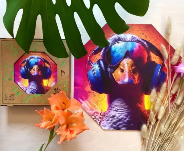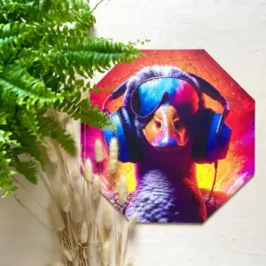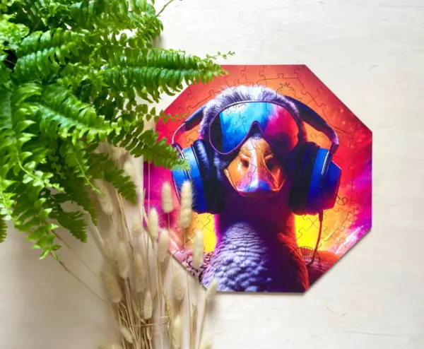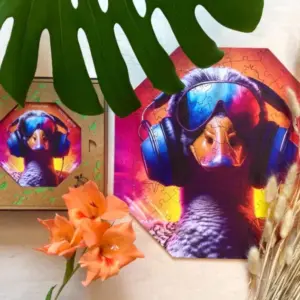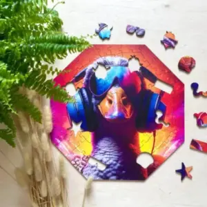 De ez még csak a kezdet. Ez a fa puzzle olyan, mintha egy másik dimenzióból érkezett volna: szabálytalan, űrszerű formák, vibráló színek és egy koncerthez hasonló látványvilág teszi igazán különlegessé. Az összerakás során egyre mélyebbre merülsz ebben a színes, pulzáló világban – mintha egy élő techno show bontakozna ki az asztalon. 🚀✨