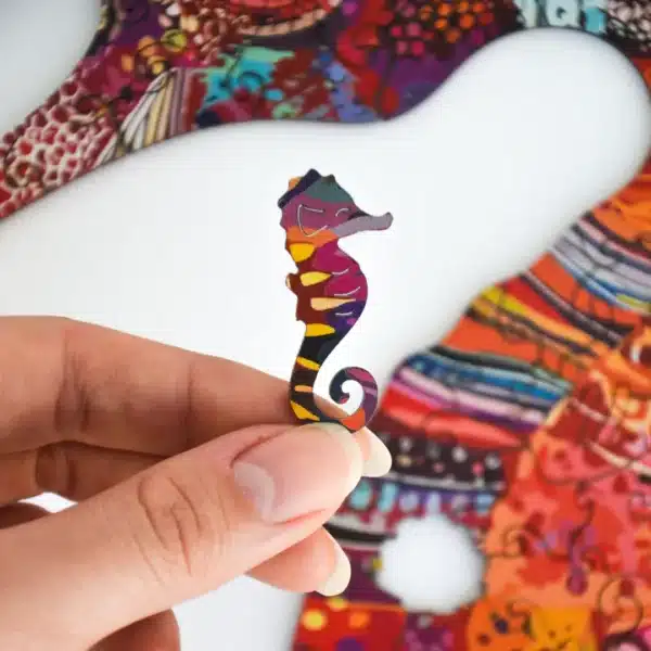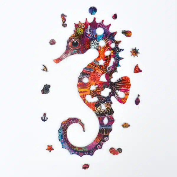 Az óceán varázsának vibráló csobbanása! Ez a csikóhal puzzle merész mintákkal és játékos formákkal, például tengeri csillagokkal, delfinekkel és korallokkal rendelkezik – mindezek lézerrel kivágott prémium minőségű fából. Ez a fából készült kirakós gyorsan a kirakós gyűjteményed kedvencévé válik.
