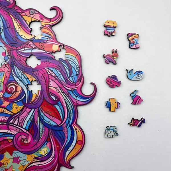 Ez a puzzle messze túlmutat a hagyományos karton kirakókon. Minden darab újrahasznosítható fából készült, és különleges formát kapott: állatok, virágok és absztrakt motívumok rejtőznek bennük, amelyek még izgalmasabbá teszik a kirakás folyamatát. Nem sablonos, ismétlődő elemekről van szó, hanem egyedi kis alkotásokról, amelyek tökéletesen illeszkednek egymáshoz.