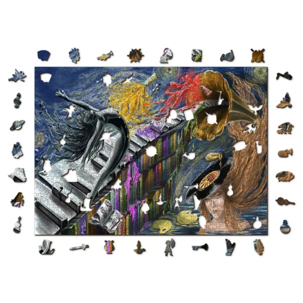 Merülj el mélyen a narratívában, amelyet ez a fa puzzle kibontakoztat. Egy lány, akinek a feje gramofonná változott, ragyogó színek sokaságát engedi szabadjára, miközben egy másik lány önfeledten táncol.